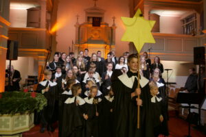 Klassische Töne gibts da eher selten, dafür moderne, teils rockige Musik in der Kirche. Begleitet von 3 Musikern, gesungen von über 50 kleinen und großen Sängern. Da kommt Freude auf in der Kirche..